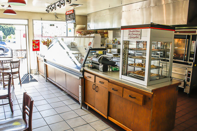 This colorful vintage style restaurant cafe and bakery features varied table seating with red and white color accents on tile flooring as well as a bakery counter with wood accents. Colorful artwork decorate the walls and large windows allow for lots of natural light.